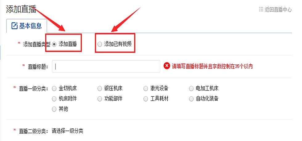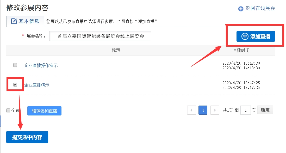 您可以直接“添加直播”;也可以從已發(fā)布直播中選擇進行參展。