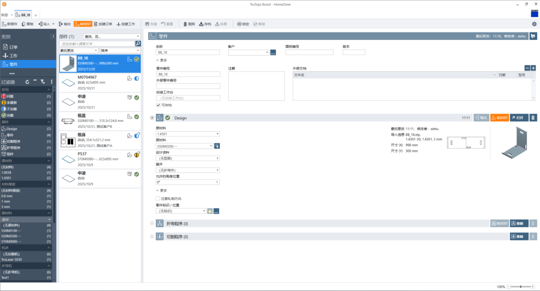 憑借 HomeZone,您可始終查看一個(gè)訂單的工序——無論是 2D/3D 設(shè)計(jì)和展開圖,還是折彎程序和排樣,亦或是切割或沖裁程序。