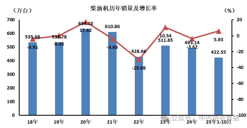 據(jù)中國內(nèi)燃機(jī)工業(yè)協(xié)會統(tǒng)計(jì)分析,2025年10月,柴油內(nèi)燃機(jī)銷售39.91萬臺,環(huán)比增長-5.39%,同比增長11.42%;1-10月累計(jì)銷量422.55萬臺,同比增長5.93%。