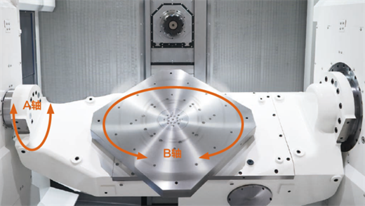 傾斜旋轉(zhuǎn)工作臺(tái)具有A軸和B軸兩個(gè)旋轉(zhuǎn)軸,通過(guò)大型鋁件的多面加工,實(shí)現(xiàn)工序集約。即使是需要從多種角度進(jìn)行加工的汽車(chē)副車(chē)架等工件,也可以利用2軸旋轉(zhuǎn)工作臺(tái)和最多4軸控制,在自由變更分度角度的同時(shí)進(jìn)行加工。(A軸:分度專(zhuān)用)